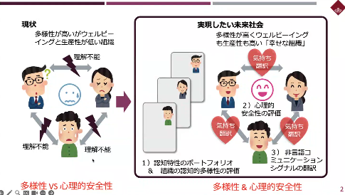 Dr. Osu: We are researching “Interactive Support for Communication in a Neurodiversity Environment” in the Future Society Creation Project. First of all, we believe that while the importance of diversity is attracting attention, in an organization with high diversity but low wellbeing and productivity, the people who make up that organization are unhappy with each other. In contrast, our goal is to realize happy organizations with high diversity and high wellbeing and productivity. We are researching the tools necessary to achieve this. In this exhibition, we will introduce some of these tools. (▲Picture 3▲)