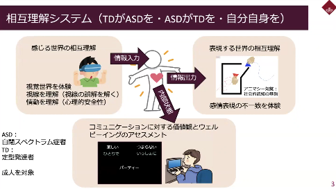 Our research targets adult people with ASD (autism spectrum disorder), but we are trying to create a “tool for TD (typical development) people to understand ASD people” rather than a “tool for ASD people to use. One such tool is a system that allows people with TD to experience the world as seen by people with ASD, and to compare the eye movements of people with ASD with those of people with TD as a tool for TDs to approach the ASD side. We are also developing other systems to learn how people with ASD feel about communicating with others, including people with TD. The goal of these efforts is to promote mutual understanding between people with ASD and people with TD. We are considering a system of mutual understanding, in which “TDs communicate with ASDs, ASDs communicate with TDs, and TDs communicate with themselves” (Photo 4). (▲Picture 4▲)
