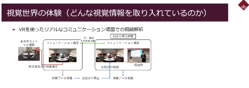 First, the system allows you to experience the visual world in VR, reproducing realistic communication situations in which multiple people with ASD and TD participate. The system also records the eye movement of the participants, allowing the participants to experience the difference in eye movement between people with ASD and people with TD. The eye movement can be displayed on top of the recorded video, so that information can be collected about what the actor, the instructor, spoke and acted out, such as “this person was looking here and this person was looking there. Again, wearing VR goggles also allows us to re-experience the world of eye movements that others have seen; by re-experiencing the gaze of the person with ASD, we can understand what information they are taking in. The movements of the eye reflect what kind of information they want to take in, what kind of things they want to see, and what kind of things they want to see. (▲Picture 5▲)