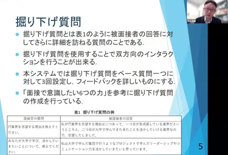 In this way, the AI interviewer asks in-depth questions in response to the interviewee’s speech, allowing the interviewee to practice for the interview. It is difficult to create the tension of an interview, but it is known to be effective to a certain extent. We think that the system will be even better if we can express the tension better. This is an issue for the future.