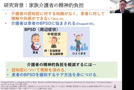 Therefore, I wanted to support family caregivers to reduce their emotional burden by learning about dementia from a young age and learning how to alleviate BPSD of dementia patients.