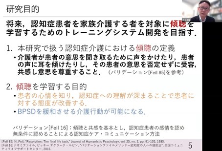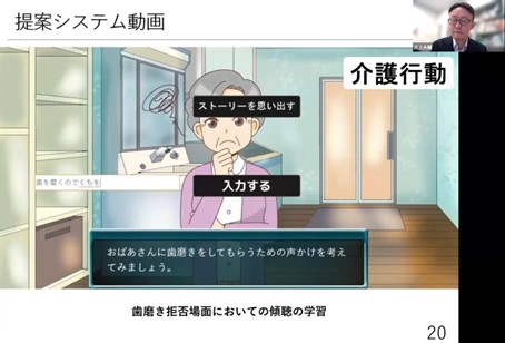 Specifically, we focused on the caregiver’s “listening. Listening is an act in which a caregiver speaks to a dementia patient to confirm his or her wishes, listens to the patient’s voice, and accepts, empathizes with, and respects the patient’s wishes without denying them. We worked on the development of a training system for family members caring for dementia patients to learn this listening skill. (▲Picture 6▲)