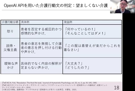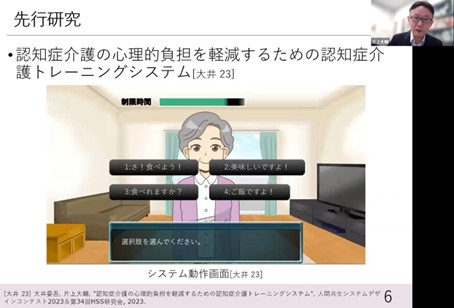 The goal is that by learning to listen, caregivers will learn to understand the patient’s emotional state and deepen their understanding of dementia, thereby improving their attitude toward the patient and enabling caregiving behaviors that alleviate BPSD. In fact, more experienced caregivers are better at listening, and we wanted to help family caregivers develop this skill, so we created a system that would serve as a precursor study. This training system creates scenarios based on several typical cases in caring for dementia patients and reproduces them on the system to learn knowledge while actually dealing with an AI agent. (▲Picture 7▲)
