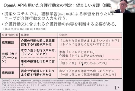 Ishido: “For example, I feel that the attitude of ‘listening’ that is emphasized in dementia caregiving is also an extremely important skill in the fields of child-rearing and education. From this perspective, this research is not limited to dementia caregiving, but could be developed as a more versatile study that focuses on the theme of “training to learn listening” itself. From this perspective, what kind of development do you envision for future research and social implementation?