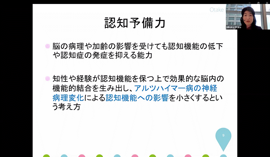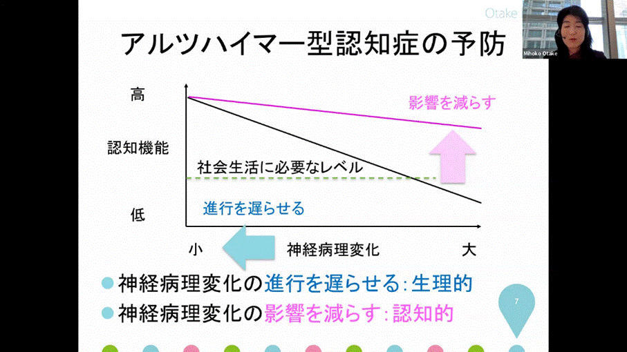 アメリカの修道女を対象に認知テストを行い、死後解剖して脳の状態を調べたところ、脳が萎縮してアルツハイマー型認知症の状態であるはずなのに全く認知症の症状が出なかった人が8%もいたということが知られています。つまり、『病理変化が起こっている状態』と『症状が出る』ことの関係が1対1ではないということ。そこで、『なぜ病理変化があっても発症しないのか』が重要となり、そこが予防の2段階目になります。
