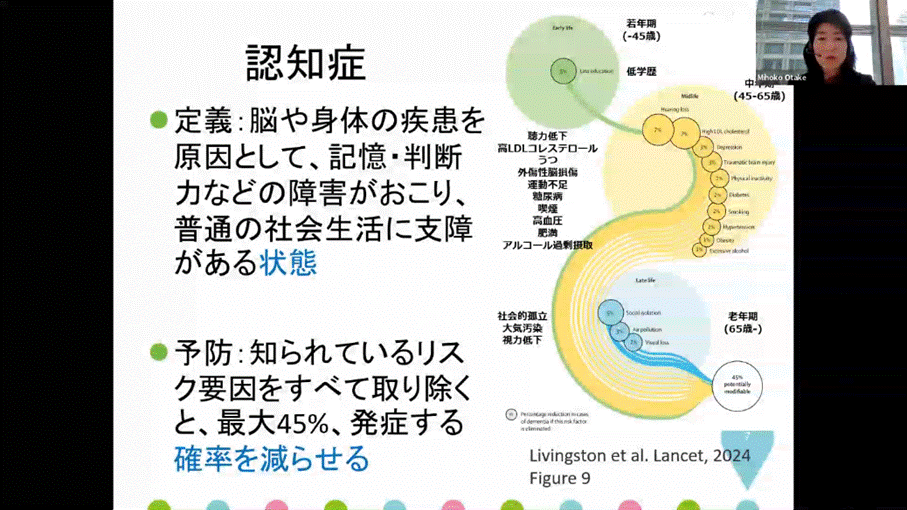 予防としては、若年期、中年期、老年期のそれぞれで知られているリスク要因をすべて取り除くと最大45%程度、発症する確率を減らせるとされています。2017年に医学雑誌『ランセット』にレポートが出稿され、現在も3~4年に1回ずつ更新されています。確定的なものではなく、現在の研究で分かっている範囲での数値であり、今後、新しい研究成果や知見が得られると、比率が変わる可能性があります。