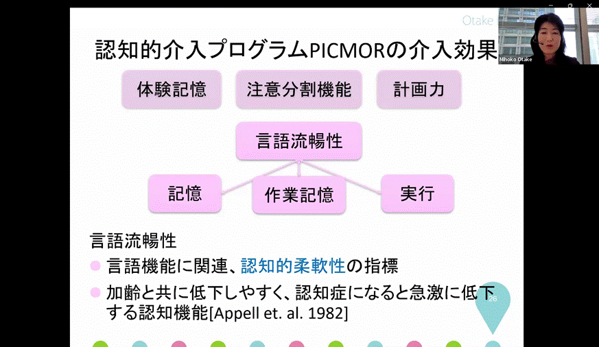 大武氏:言語流暢性に関して言うと、介入することで認知機能が上がっています。ただ、その他についてはそう簡単には上がりません。評価方法も、もっと長い時間介入して、何もしない人は下がるけれども、やっている人は下がり方が緩やかであるといった方法で、違いを示す必要があります。そうすることで、今、注目している3つの機能の違いも出る可能性が今後あると考えています。