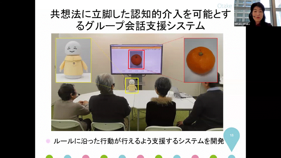 このシステムではロボットの『ぼのちゃん』がグループの会話を進行します。ロボットを使うことで、1人の実施者で複数の少人数グループの会話を同時に運営することができます。そして、ルールを守らない人がいた時にはロボットが遠慮なく指摘し、話が多い人を止めて少ない人に当てるといったことも自動で実行します。