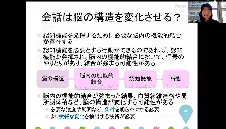 それぞれのグループの会話にどのような特徴があったのかも調べています。介入群の会話では、単語に対する単語種類数が多く、たくさんの語彙が使われるような会話をしていました。雑談の統制群の会話では繰り返しが多くありました。『共想法』の方が、発言の種類としても、意味のある発言の割合が多いということも確かめられました。さらにMRIを用いて脳に与える影響を解析したところ、関連する脳の領域間のつながりが良くなって体積が増加する可能性を予備的に確かめました。