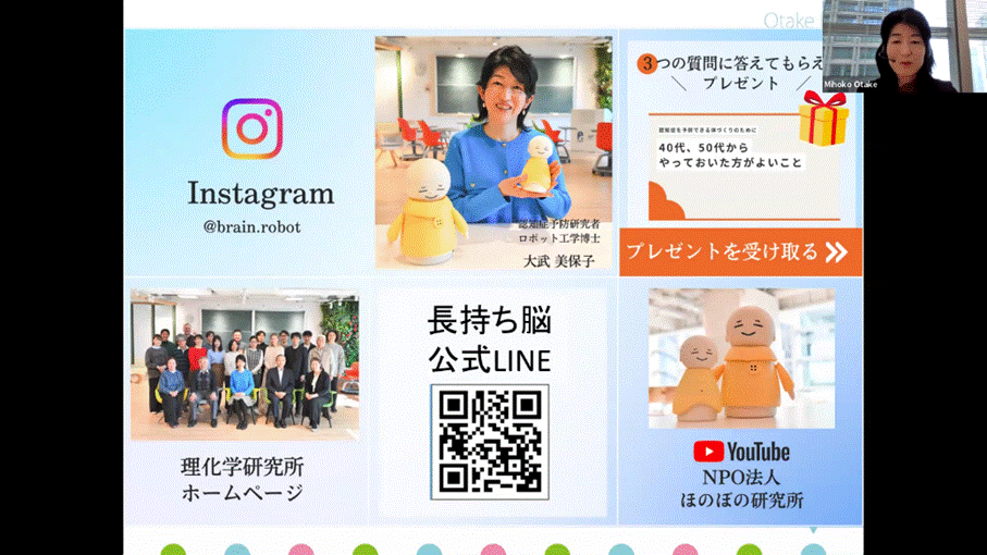 また、研究しながら認知症の予防の知識がまだ全く普及していないという課題を実感していまして、公式LINEを作ったり、Instagramで発信したり、YouTubeで動画を配信したりといった取り組みもしていますので、よろしかったらぜひ登録ください。(▲写真17▲)