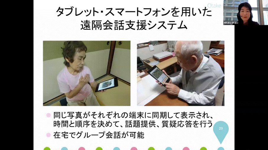 タブレットやスマートフォンを用いた遠隔会話支援システムでは、同じ写真がそれぞれの端末に同期して表示され『共想法』ができます。在宅でグループ会話が可能なことから、コロナ禍を機に当事者研究でも導入しました。家から出られない状態の人や遠方の人でも参加できるので、コロナ禍が明けた2023年以降も継続してこのシステムを使い、現在月1回、定期的に開催しています。対話支援ロボットは、埼玉県和光市、遠隔会話支援システムは、埼玉県和光市と大阪府岸和田市の自治体の協力を得て実験を行いました。