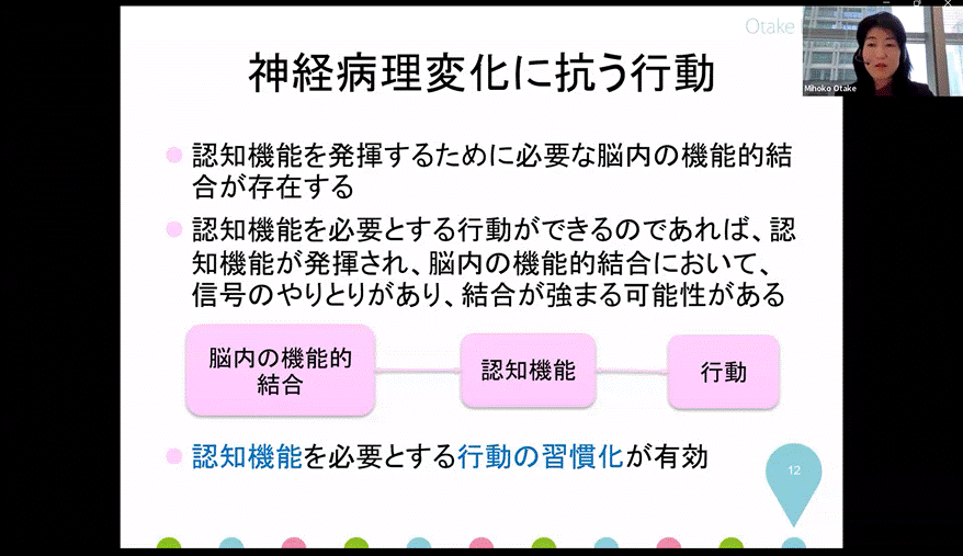 神経病理変化に抗う行動とは何かを考えてみます。認知機能を必要とする行動をすると認知機能が発揮され、認知機能を発揮するために必要な脳内の機能的結合において信号のやり取りがあり、ネットワークの中で電気信号が飛び交うことになって、結合が強まる可能性があると考えられています。これによって神経病理変化に抗うことになります。つまり、認知機能に対応する行動を習慣化しておくことが有効と考えられています。(▲写真8▲)