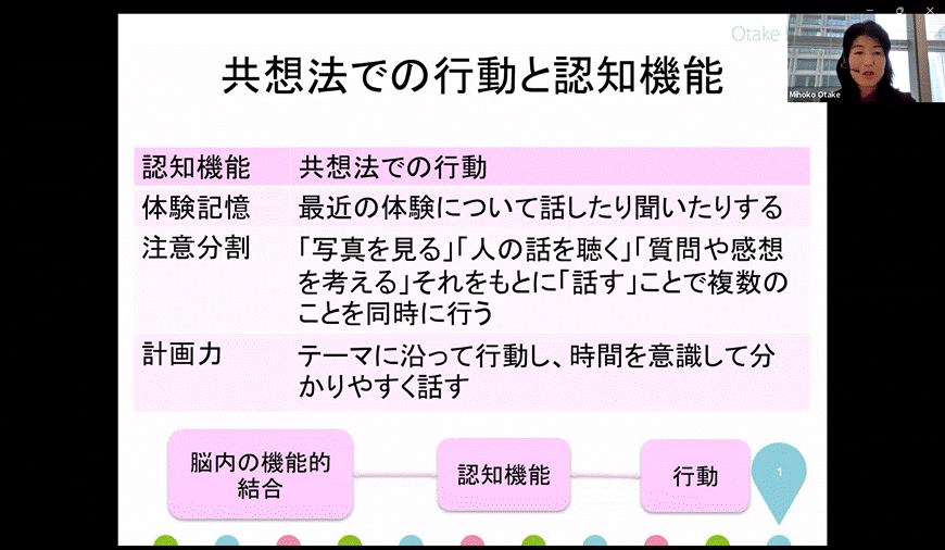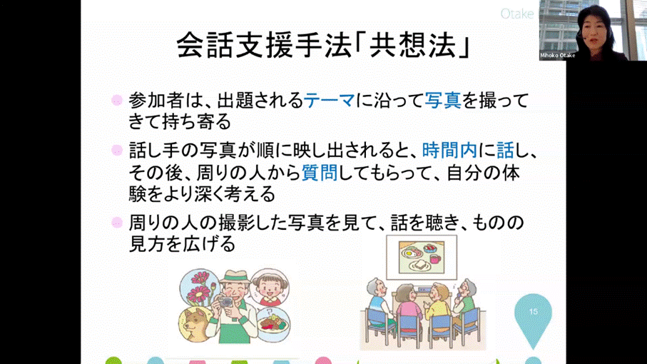 この『共想法』では、最近の体験について話したり聞いたりすることで、体験の記憶、写真を見る、話を聞く、質問をする、考える、そして話すという複数のことを同時に行います。ここで注意分割機能を使うようになります。そして、テーマに沿って行動し、時間を意識して分かりやすく話すところで計画力を使います。このように3つの行動を行うことで3種類の認知機能が活用され、ひいては認知機能を発揮するのに必要な脳内の機能的結合も強化されうることになります。(▲写真12▲)