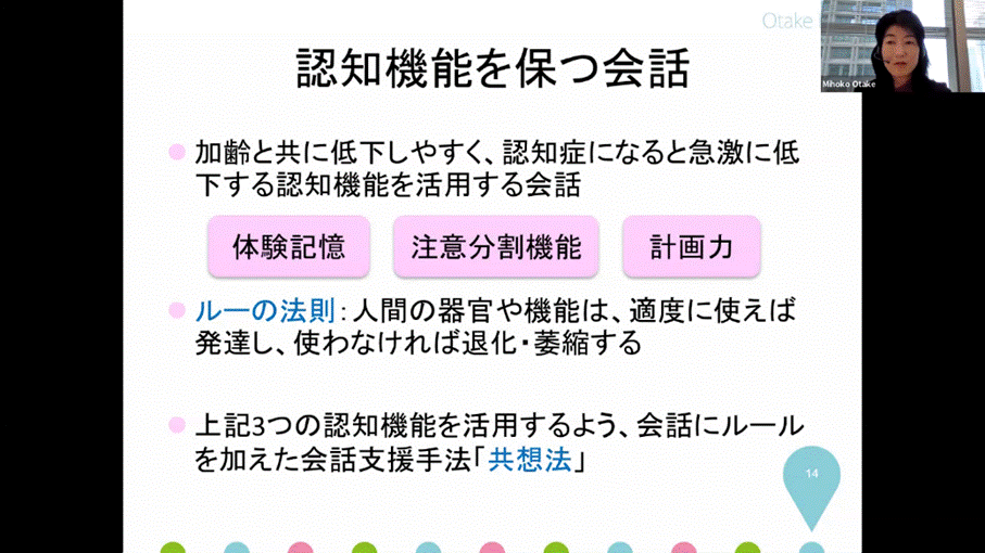 これは、予防と共生の中の共生と言われていますが、認知症の定義からすると、社会生活に支障がある状態を指していますので、認知機能が下がっても、社会的生活に支障がなければ定義上、認知症とは呼ばないことになります。認知症にならない社会と言うと『認知症の人を排除するのか』とよく聞かれますが、そうではありません。そもそも困っていないのであれば、認知症の厳密な定義からは外れるということになりますので、少々認知機能が下がったぐらいでは困らない仕組みを用意できれば、原因疾患を持っている人はもちろん減らせますし、原因疾患がある、かつ認知機能が下がってしまったという人がいたとしても、それほどには困らない状況が作り出せるはずです。脳が長持ちする会話をみんなで実践していければ、より認知症にならない社会になっていけるのではないかと考えています。