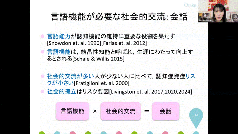 そこで、私たちは言語機能を使うもの、そして社会的交流の基礎である会話をうまく介入手段として使うことで、認知機能が維持できるとのではないかと考えました。さらに、どんな会話でもいいのかというと、おそらくそうではないと考え、認知機能を保つ性質を持った会話、すなわち認知機能を活用するような会話をうまく使えば認知機能が維持できると考えました。