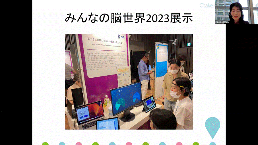 認知機能を検出するには、さまざまな手段があります。認知課題を設計して、その課題に取り組んでいるときにどのような脳波が出ているかを計測し、機械学習で認知機能が下がっているかどうかを判別するという研究に取り組んでいます。その一環として『みんなの脳世界』の展示では、『リラックスする』という課題に取り組んでもらうゲームを展示しました。多くの子供たちに参加していただきましたが、簡単に言うと「どちらがよりリラックスできるか」を競い合うものです。意識してリラックスする、意識して自分の状態をコントロールする力が下がっているかどうかを判別するデモでした。(▲写真3▲)
