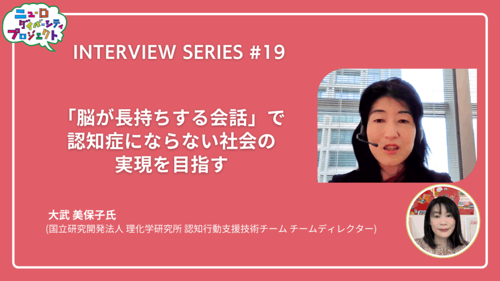 人間の脳や神経はとても多様で誰もが独自の特徴を持っています。B Labでは、そんな個人の特性を「強み」に変え、誰もが力を発揮できる社会の実現を目指すニューロダイバーシティプロジェクトを推進し、展示会「みんなの脳世界」を通じて企業や大学、研究機関の最新の研究成果や取り組みを紹介しています。今回は生理的・認知的・社会的の3方向のアプローチで認知症にならない社会の実現に取り組んでいる国立研究開発法人 理化学研究所 認知行動支援技術チームの大武 美保子氏(▲写真1▲)に、展示内容と最新の研究成果などについて、「みんなの脳世界」展を推進する B Lab所長の石戸 奈々子(▲写真18▲)がお聞きしました。