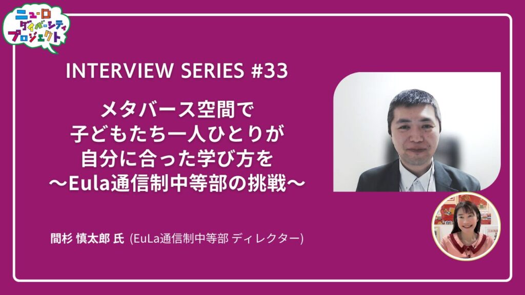 B Labが主催する「ニューロダイバーシティプロジェクト」では、脳や神経の多様性を尊重し、誰もが自分らしく力を発揮できる社会の実現を目指しています。今回のニューロダイバーシティプロジェクト・インタビューシリーズでご紹介するのは、2025年の「みんなの脳世界」に初めて出展したEuLa(ユウラ)通信制中等部 ディレクター 間杉 慎太郎氏(▲写真1▲)の取り組みです。メタバース空間を活用し、さまざまな特性を持った生徒の学習をサポートしているEuLa通信制中等部(以下、Eula)の取り組みについて、B Lab所長の石戸 奈々子(▲写真2▲)がお聞きしました。