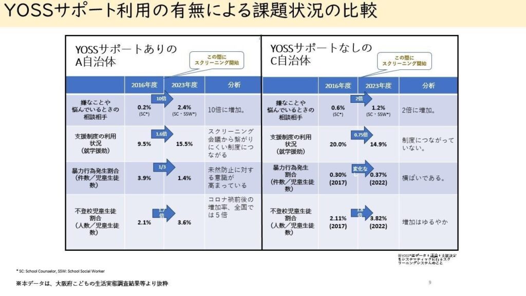 YOSSサポートを使うと必要な支援やサービスにつながるスクリーニングシステムを丁寧に提案する、ため、サポートの有無によって結果に違いが出ることがよく分かります。単にスクリーニングのデータを使うだけでなく、価値や理念、サポートの意味を理解した上でスクリーニングを実行すると、リスクを抱えている可能性のある子どもの早期発見と適切な対応に、より効果があるといえるでしょう。