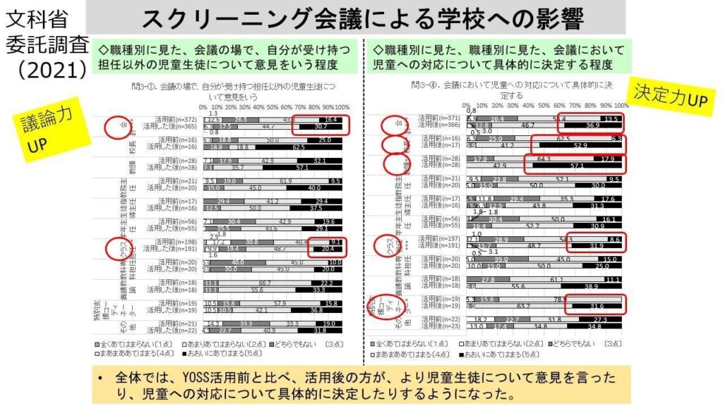 また、学校では、いわゆる『学級王国』(担任によるクラス運営が、周囲からの干渉を受けずに閉鎖的な環境で実施されている状態)となることもあり、担任をしていないクラスの子どもについては発言しにくいといったことがあります。スクリーニングをすることで、そうした状況が改善する傾向が見られます。『会議の場で、自分が受け持つ担任以外の児童生徒について意見を言う程度』は2倍近くに増加しています。(▲写真8/左側の調査結果▲)