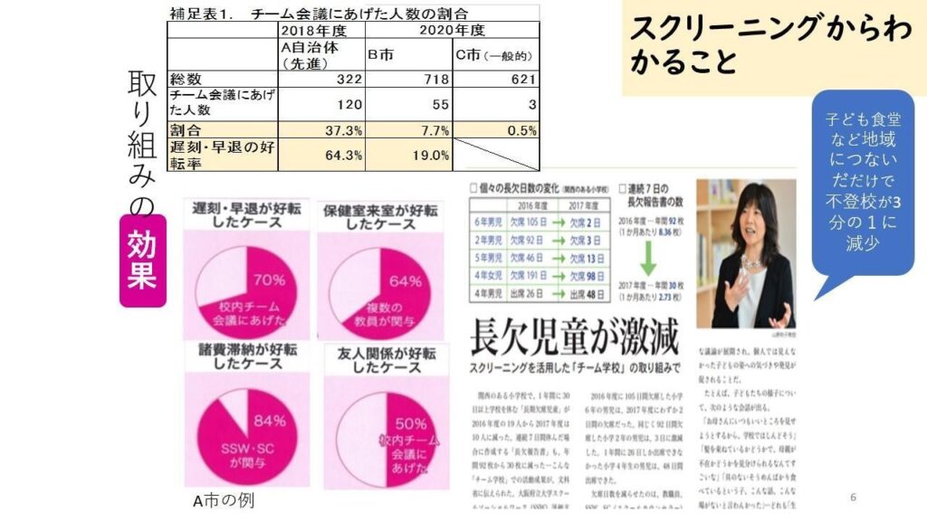 山野氏:「次にスクリーニングによって子どもたちの状態を把握し、手助けを必要としている子どもを見つけだして適切に手を差し伸べたことによる具体的な効果を紹介します。ある自治体では『遅刻・早退』が70%、保健室来室が60%も好転しました。また、いじめなどの友人関係の問題が好転したケースが50%、諸費滞納も84%好転しています。さらに不登校や長期欠席も3分の1に減少しました。(▲写真7▲)