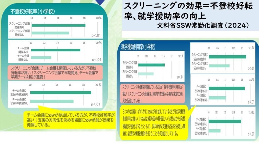 スクリーニングは、科学的エビデンスに基づくシートを用いることで、すべての先生が同じ目線を持ってチェックできるようにしたものであり、特別に負担が増えるわけではありません。むしろ毎月チェックしている学校のほうが先生の負担が減っていることが分かっています。最低でも学期に一度チェックするだけでも変化は見られるはずです。(▲写真9/右側の調査結果▲)。