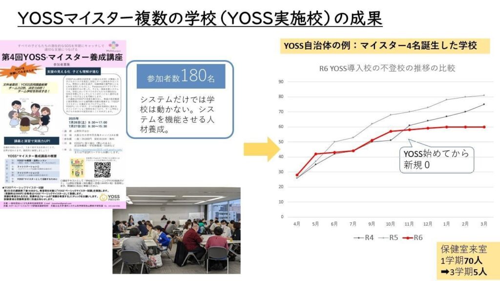 さらに、私たちの研究室では、スクリーニングを理解し実践できる人材を増やしたいという願いから『YOSSマイスター養成講座』を開いています。YOSSというシステムだけを用意しても学校は動きません。システムを機能させ、活用する人材が必要ということで、人材養成講座を実施しており、現在180名が参加しています。