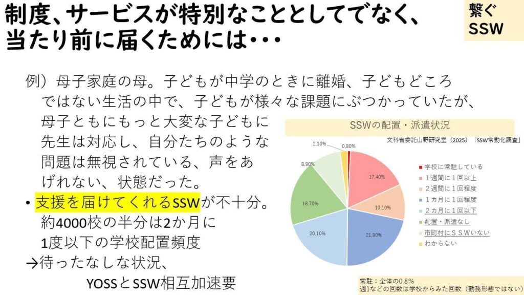 こういったサポートはスクールソーシャルワーカーの仕事ではないかという意見もあります。しかし、文科省として調査した4000校あまりのうち、半分近くの学校ではスクールソーシャルワーカーの配置頻度が2ヶ月に一度以下でした。(▲写真11▲)