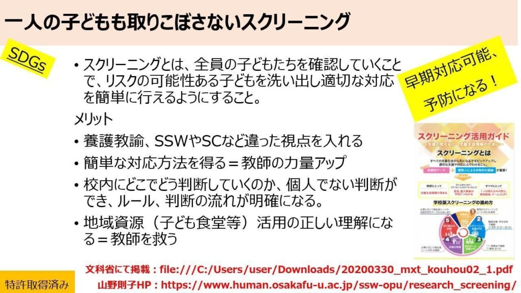 これでは丁寧に支援したくてもできず、どうしても取りこぼしが発生してしまいます。そのような状況下でスクリーニングを使うことは非常に有効だと考えています。スクールソーシャルワーカーが不要ということではなく、まずは何もしない状態が続くのではなく、実行できる対応や支援を子どもたちに届けたいという思いで始めたのがスクリーニングです。