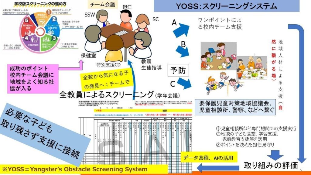 そこで、科学的なエビデンスに基づいて構築されたスクリーニングシートを活用して気になる子どもを拾い上げ、声をかける仕組みを作っています。また、今はNPOや地域の活動が活発化しており、学習支援や子ども食堂といった地域資源が生まれています。しかし必要な子どもに必要な資源がつながってないです。このハブになるのがYOSSで、社会資源やその活用方法の紹介をしています。