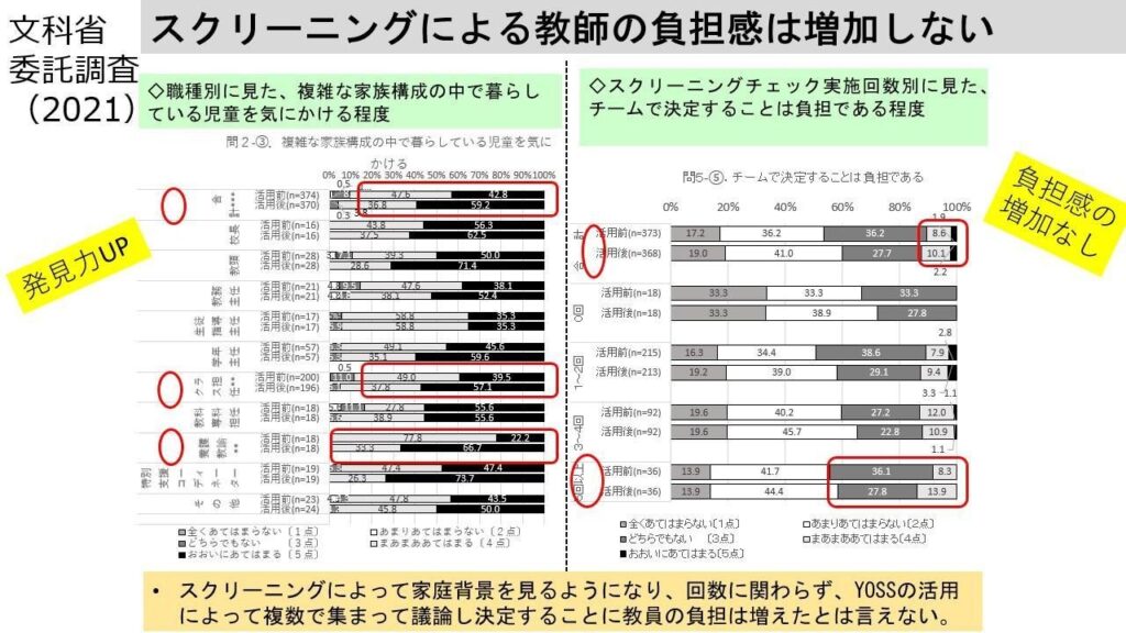 さらに、『複雑な家族構成の中で暮らしている児童を気にかける』割合も養護教諭では3倍近くに増加しています。スクリーニングを実施することで、先生の目線が変化し、統一性ができているのも成果の一つです」。(▲写真9/左側の調査結果▲)