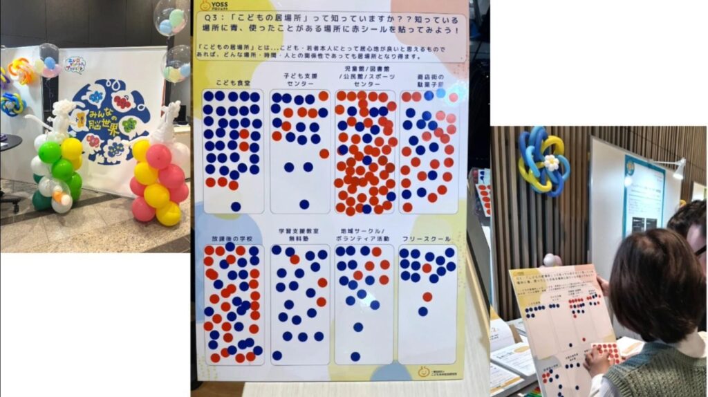 会場では、子どもたちのモヤモヤしている思いを付箋に書き出してもらったり、知っている『子どもの居場所』にシールを貼ってもらったりといったワークを体験してもらいました。(▲写真3▲/▲写真4▲)