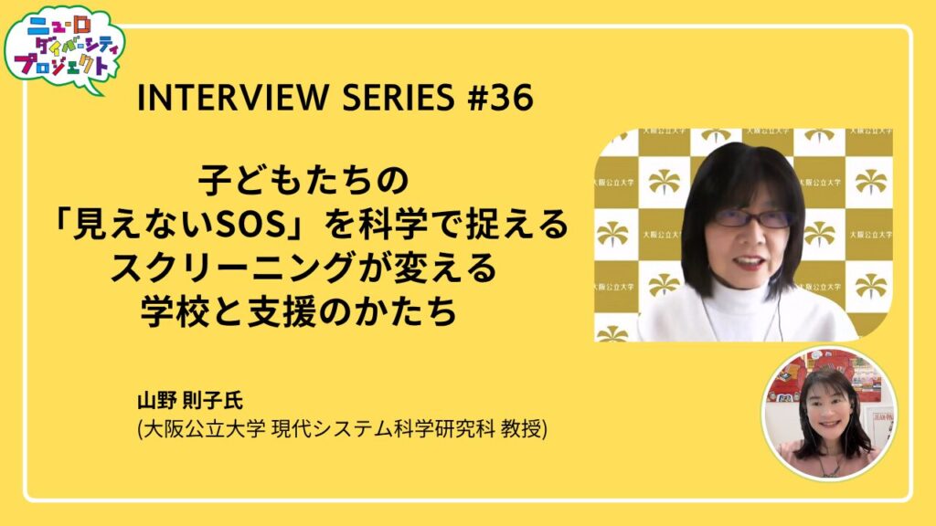 B Labが主催する「ニューロダイバーシティプロジェクト」では、脳や神経の多様性を尊重し、誰もが自分らしく力を発揮できる社会の実現を目指しています。今回のニューロダイバーシティプロジェクト・インタビューシリーズでご紹介するのは、2025年の「みんなの脳世界」に初めて出展した大阪公立大学 現代システム科学研究科 教授 山野 則子氏(▲写真1▲)の取り組みです。山野則子研究室では、虐待やいじめ、貧困など表面化しにくい子どもたちの問題の早期発見・早期対応を目的とした「スクリーニング」を研究しています。そんな山野氏の研究について、B Lab所長の石戸 奈々子(▲写真2▲)がお聞きしました。