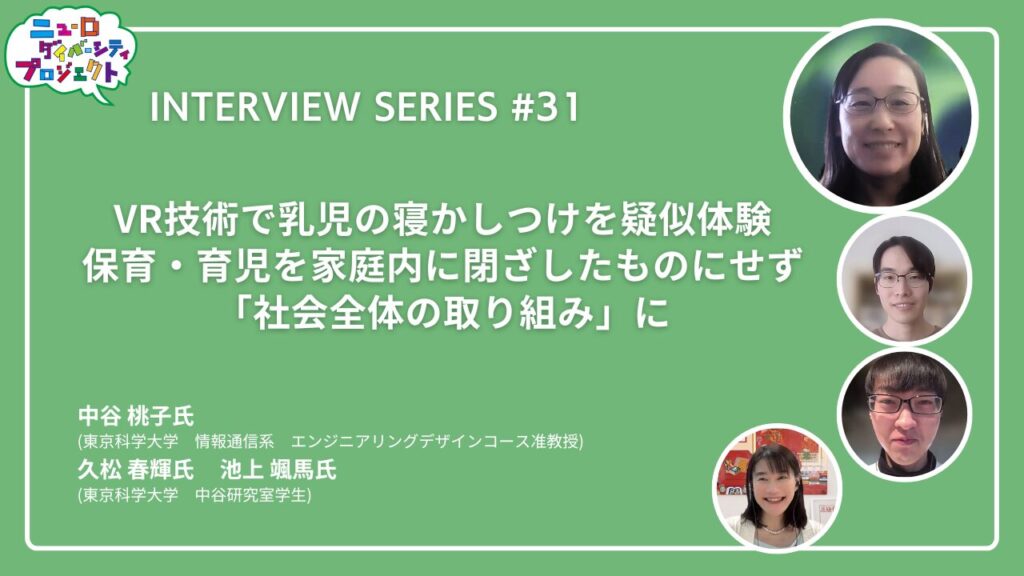B Labが主催する「ニューロダイバーシティプロジェクト」では、脳や神経の多様性を尊重し、誰もが自分らしく力を発揮できる社会の実現を目指しています。今回のニューロダイバーシティプロジェクト・インタビューシリーズでご紹介するのは、東京科学大学 情報通信系 エンジニアリングデザインコース 准教授 中谷 桃子氏(▲写真1・左上▲)と、中谷研究室学生の久松 春輝氏(▲写真1・左下▲)、池上 颯馬氏(▲写真1・右下▲)の取り組みです。中谷氏は2025年の「みんなの脳世界」で、VR技術を使って乳児の寝かしつけを疑似体験できる取り組みを紹介し、子育て世代ではない若者に当事者意識や興味関心を持ってもらうことを目指しました。そんな中谷氏の研究活動について、B Lab所長の石戸 奈々子(▲写真1・右上▲)がお聞きしました。