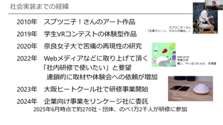 このシステムは現在、社会実装して企業向けの研修事業として提供しています。社会実装までの経緯をまとめると、もともとはアーティストのスプツニ子!氏がアート作品の中で紹介していたのですが、それを甲南大学の学生らがVRコンテストである『IVRC』の中で体験型作品として実装しました。その学生が私の研究室に進学してきて、苦痛の再現性をテーマに研究を継続したのです。(▲写真10▲)