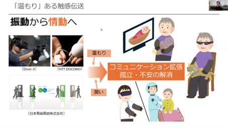 温度刺激を通じて人と触れ合うことは、肉体的な面でも精神的な面でも健康への良い影響があると考えています。こうした背景から、『みんなの脳世界』では既存のオンラインコミュニケーションツールを活用して、温度も含めた触感を伝える技術を紹介しました。(▲写真5▲)