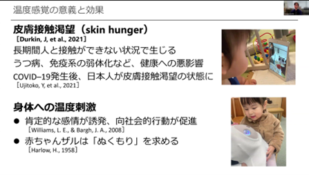 特にコロナ禍の後には、多くの方が皮膚接触渇望になっているという調査結果も出ています。そこで、触感、特に温度感覚が大事だと考えています。温度感覚について、人と触れ合ったときに『人の肌のぬくもり』を感じたことがあると思います。ぬくもりや人に触れたときに感じる温度、これらが人間にとって大切であるということは、なんとなく直感的にご理解いただけると思いますが、実は学術的にもさまざまな根拠が示されているのです。