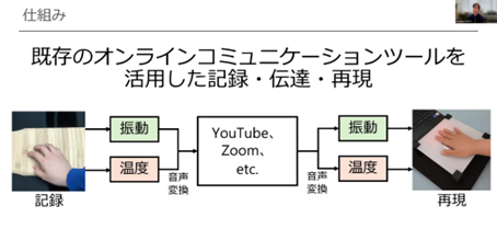 まずはある素材に触れていただき、触ったときの振動や温度を記録します。この触感の情報を音声に変換し、YouTubeやZoomなどの既存のオンラインコミュニケーションツールで伝達します。そして、伝わってきた触感の振動を音声から振動や温度という情報に再変換すると、あたかも木材に触れたような感覚や人肌に触れたような感覚、温かい、冷たいといった感覚も一緒に体感できるようになります。特に今回のデモンストレーションでは、こうした触れている感覚、触感を含んだ動画をYouTube上にアップロードして、YouTubeの動画を再生すると、触感も一緒に体感できるようにしました。