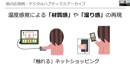 こうした触感を伝えることは、もともとは多様なコミュニケーションを実現するための実装を目指していましたが、他にもデジタル技術を使って触覚(ハプティック)を人工的に作り出す技術であるデジタルハプティクスティクスアーカイブを活用した『触れるネットショッピング』の実現にも応用できると考えています。(▲写真6▲)