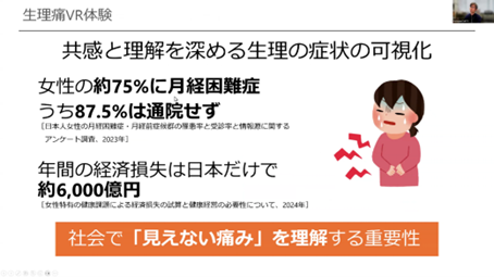 先ほどのお話では、研修などにも活用されているとのことでした。生理痛は男性には実感しづらく、女性同士でも重さや感じ方に大きな個人差があります。そうした中で、このVRを導入することで、行動の変化や意識の変容がどの程度生まれているのか、ダイバーシティの観点から興味深いデータが得られているのかについても伺えればと思います」。
