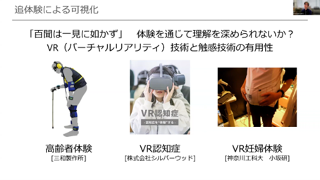 そこで、バーチャルリアリティや触感を再現する技術が有用だと考えました。実際、高齢者になったときのことを体験するという意味で身体の一部を拘束したり、見え方や聞こえ方に制限をかけたりする方法もありますが、一方ではVR技術を使って認知症の方の生活を自分の視点で追体験する、妊婦のお腹で赤ちゃんが育っていく様子を触感も交えて体感するなど、VRや触感の技術を使ったシステムも近年、増えています。(▲写真8▲)