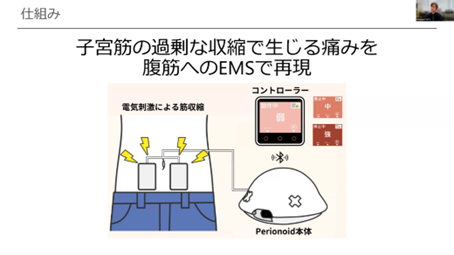 腹筋ですので子宮筋よりも表面的な場所にはあるのですが、部位的には比較的近い位置にあります。かつ、筋の収縮による痛みの種類は同じにできるのではないかという発想です。実際に女性にも実装していただき、さまざまな方々から評価をいただきました。たしかに電気的な刺激ですので違う面もありますが、筋の収縮による痛みという面では近しいところもあるということで評価をいただいています。