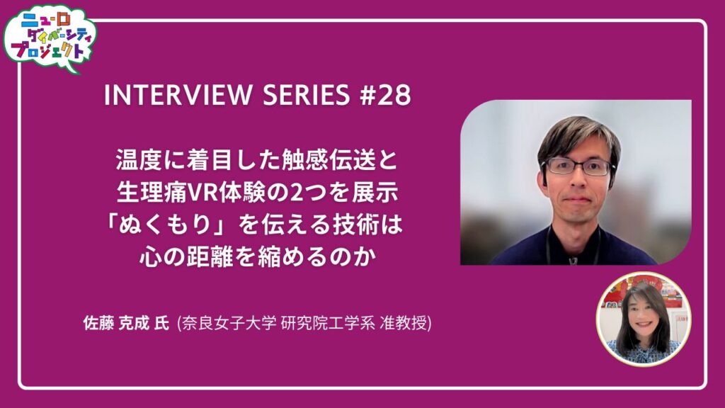 B Labが主催する「ニューロダイバーシティプロジェクト」では、脳や神経の多様性を尊重し、誰もが自分らしく力を発揮できる社会の実現を目指しています。今回のニューロダイバーシティプロジェクト・インタビューシリーズでご紹介するのは「みんなの脳世界」に今年初めて出展した奈良女子大学 研究院工学系 准教授 佐藤 克成氏(▲写真1▲)の取り組みです。佐藤研究室では「ぬくもり」ある触感伝送と生理痛VR体験という2つの取り組みを紹介しました。これらの研究に取り組んだ背景や現在の研究成果、今後の展望についてB Lab所長の石戸 奈々子(▲写真2▲)がお聞きしました。